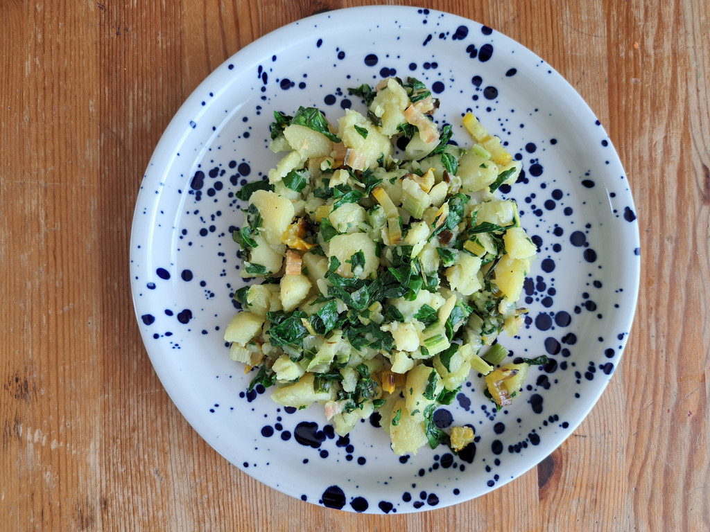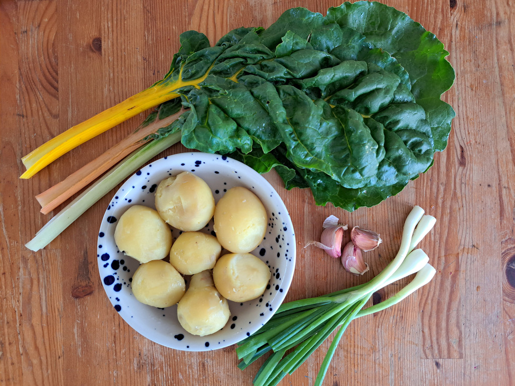 A második étel egy hagyományos horvát köret volt, amelyhez olívaolajat, újhagymát, fokhagymát, mángoldlevelet levélnyéllel együtt és burgonyát használtam fel, a fűszerezéshez csak sót és borsot szórtam a párolódó zöldségekre. Eredetileg halételekhez vagy húsokhoz tálalják, mi most tükörtojással fogyasztottuk.