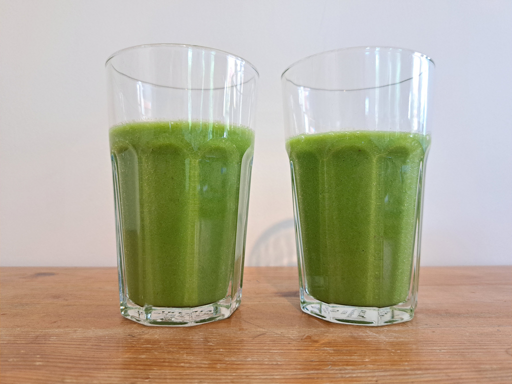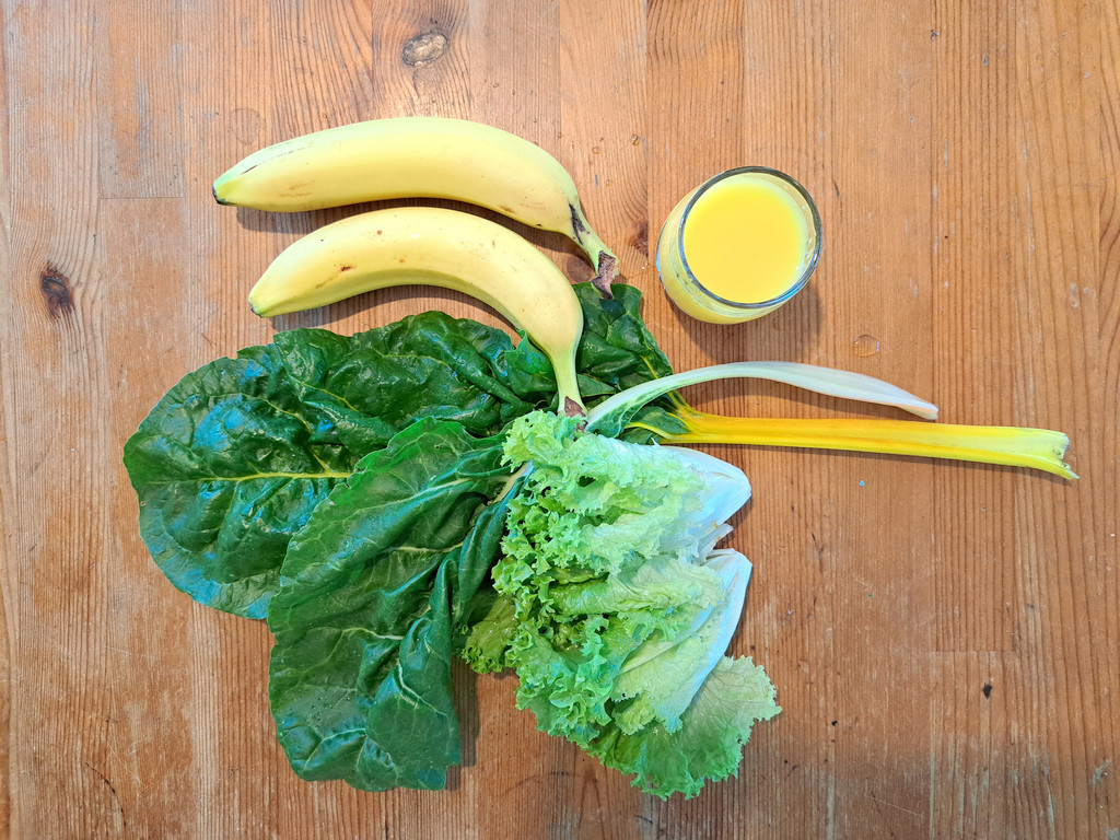 Elsőként egy friss smoothie-t turmixoltam nyers mángold, banán, tépősaláta, narancslé és víz felhasználásával. Nagyon kellemes, selymes, enyhén édes italt kaptunk. Érezhető volt a mángold jellegzetes íze és a tépősaláta kissé kesernyés aromája is. A smoothie-ból természetesen kihagytam mángoldlevelek szárát és főereit.