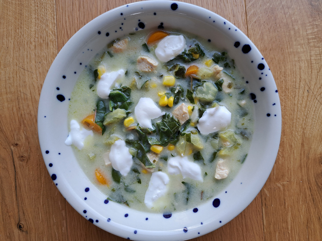 A harmadik mángoldos fogás egy raguleves, melyhez olívaolajat, csirkemellet, sárgarépát, petrezselyemgyökeret, csemegekukoricát, mángoldlevelet levélnyéllel együtt, fokhagymát és újhagymát használtam fel és tejfölös habarással sűrítettem. A fűszerezés só, bors és babérlevél volt, friss citromlével fejeztem be. Nagyon kellemes, üde nyári leves lett belőle.