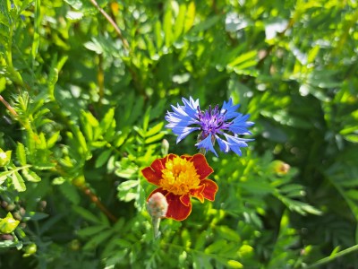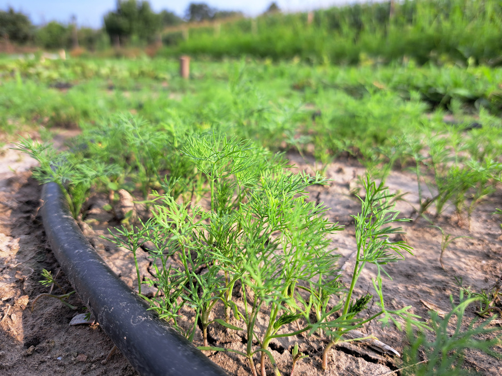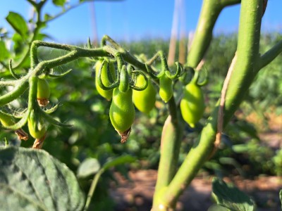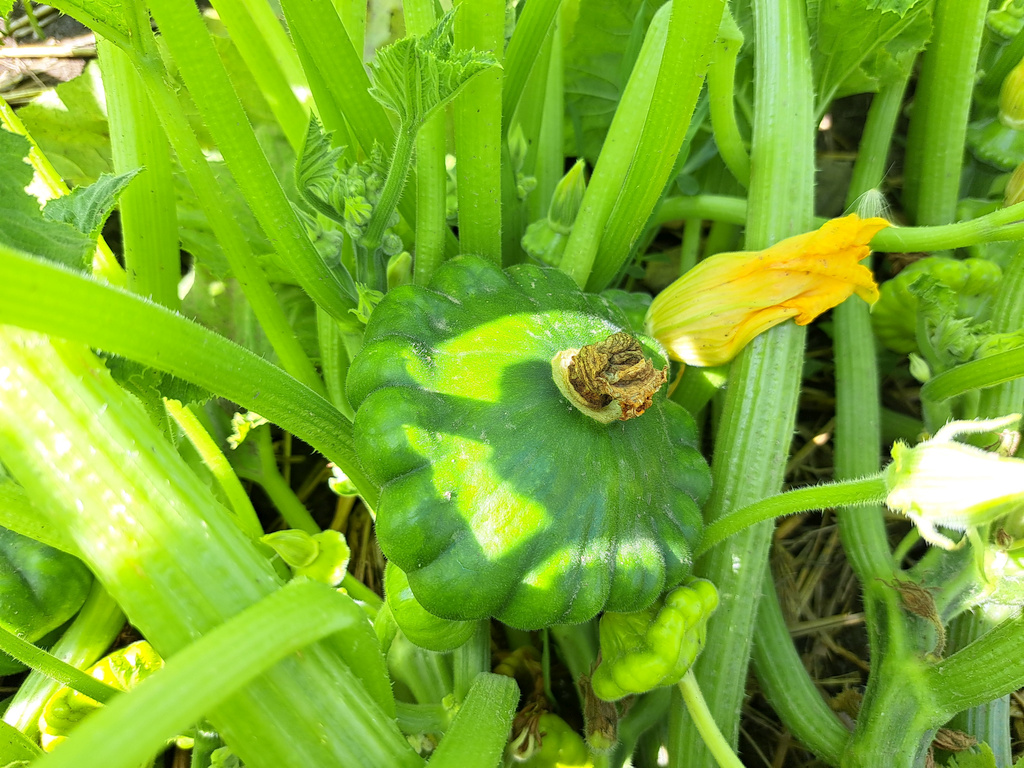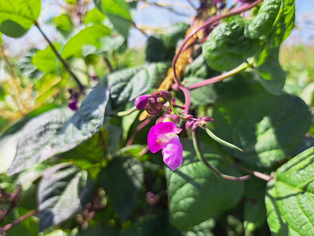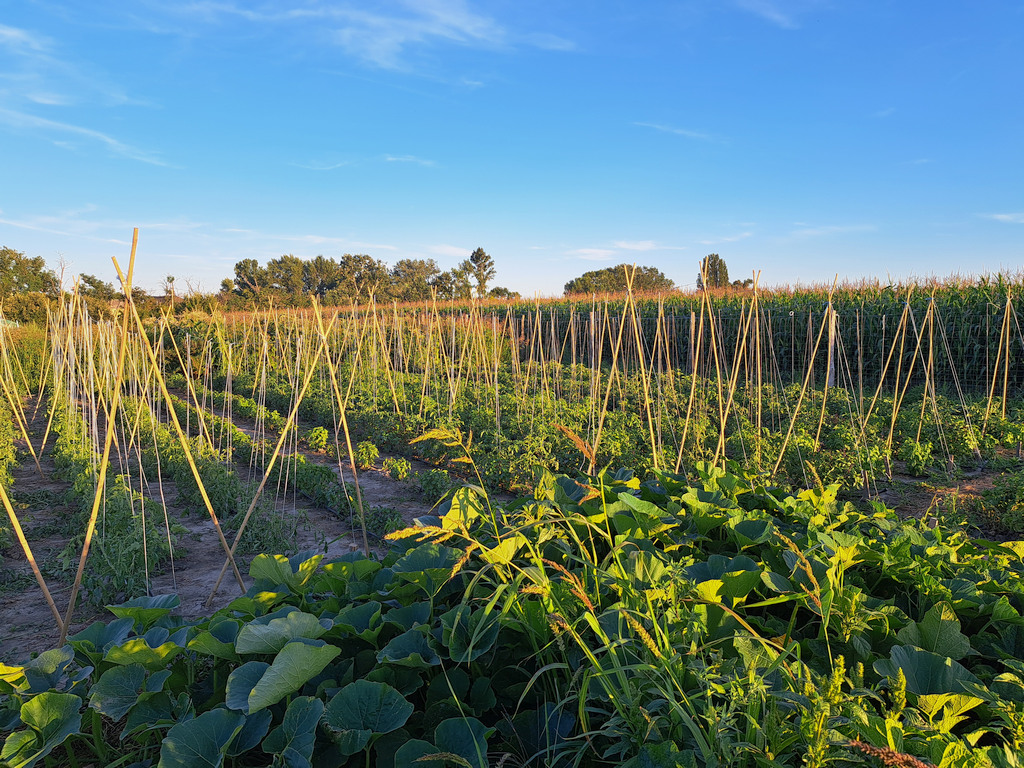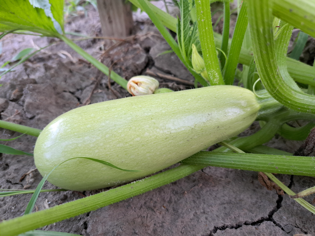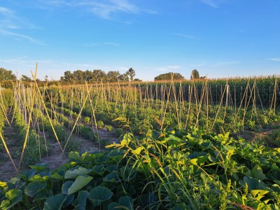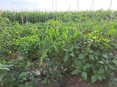 A múlt hét nagy munkája a bambuszokból készített paradicsom támrendszer felállítása, a paradicsomok felkötözése és metszése volt. A paradicsom hihetetlen növekedési erélyét mutatja, hogy egy hét sem telt el a hónaljazástól és az első sorokat máris lehetett csavarni és kacsozni ismét. Haladtunk a csepegtető öntözőrendszer bővítésével is, már nagyon kevés olyan ágyás vagy sor van, ahova még nem jutott cseppcső. Gyönyörűen fejlődik a Sweet Dumpling sütőtök, az édesburgonya egészen megtáltosodott, a csemegekukorica pedig reméljük, néhány nap múlva már szedhető lesz. A káposztafélék palántáit kimenekítettük a fóliasátorból egy árnyékolóval ellátott, szellős zugba, de meg kell várnunk a kiültetésig az enyhülést. Addig is előkészítettük a területet számukra. A gyomlálás továbbra is a legfontosabb munka, ugyanakkor a legnehezebb is, mégpedig a rendkívül sok, agresszívan terjedő, évelő fenyércirok miatt. Visszasírjuk a júniust, amikor még csak a disznóparéj és a parlagfű miatt kellett aggódnunk.