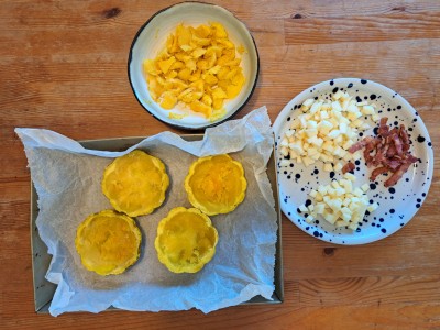 Amíg a tökök sülnek, az almát, sajtot apró kockákra vágjuk. A bacont is felvágjuk, lepirítjuk.