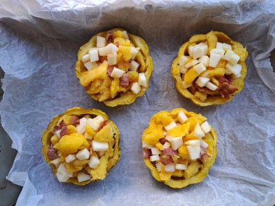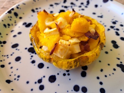 Összekeverjük a tökhússal a sajtot, bacont, almát és visszatöltjük a tökhéjakba.