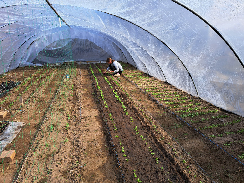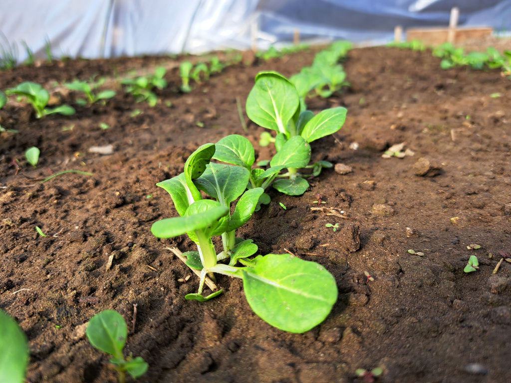 Az első zöldségdobozokat a fűtetlen fóliasátorból fogjuk megtölteni. 16 növényfajt vetettünk el benne februárban és március elején, ezek között a levélzöldségek (mini bok-choi, winterchoi, spenót), újhagyma és hónapos retek lesznek a legelsők, majd csatlakoznak hozzájuk a saláták (Lollo bionda és Lollo rossa tépősaták, batávia saláta, oriental mix, madársaláta), a cukorborsó, kínai spárga és újfokhagyma, a zöldfűszereket pedig a kapor és a kerti zsázsa képviseli.