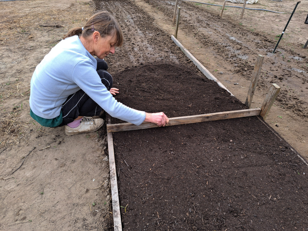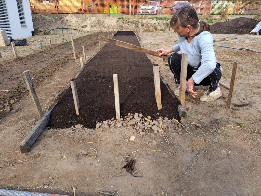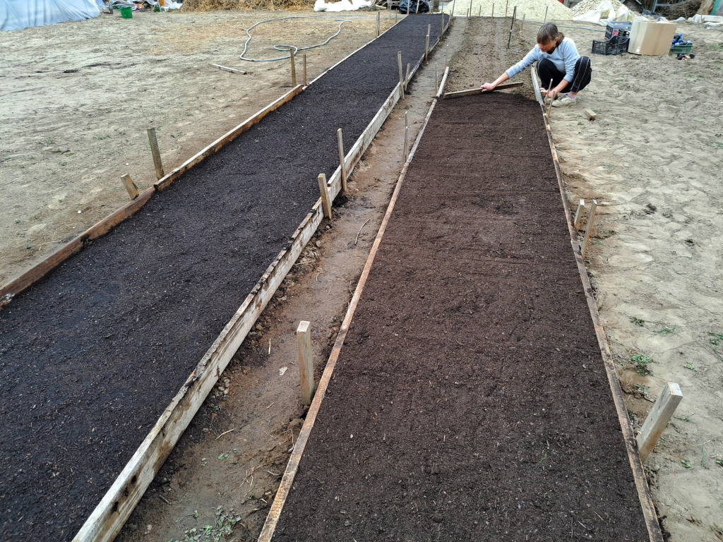 A kert méretéből és a talaj állapotából adódott, hogy biointenzív módon fogjuk idén a zöldségféléket termeszteni. Ez azt jelenti, hogy a talaj forgatása nélkül, egy 10 cm vastag komposztrétegbe vetjük el magokat, illetve ültetjük a palántákat. Ehhez megbízható, biogazdálkodásra alkalmas, minősített komposztot szereztünk be, ennek az ágyásra terítése, egyengetése folyamatosan történik, ahogy az időjárás engedi.