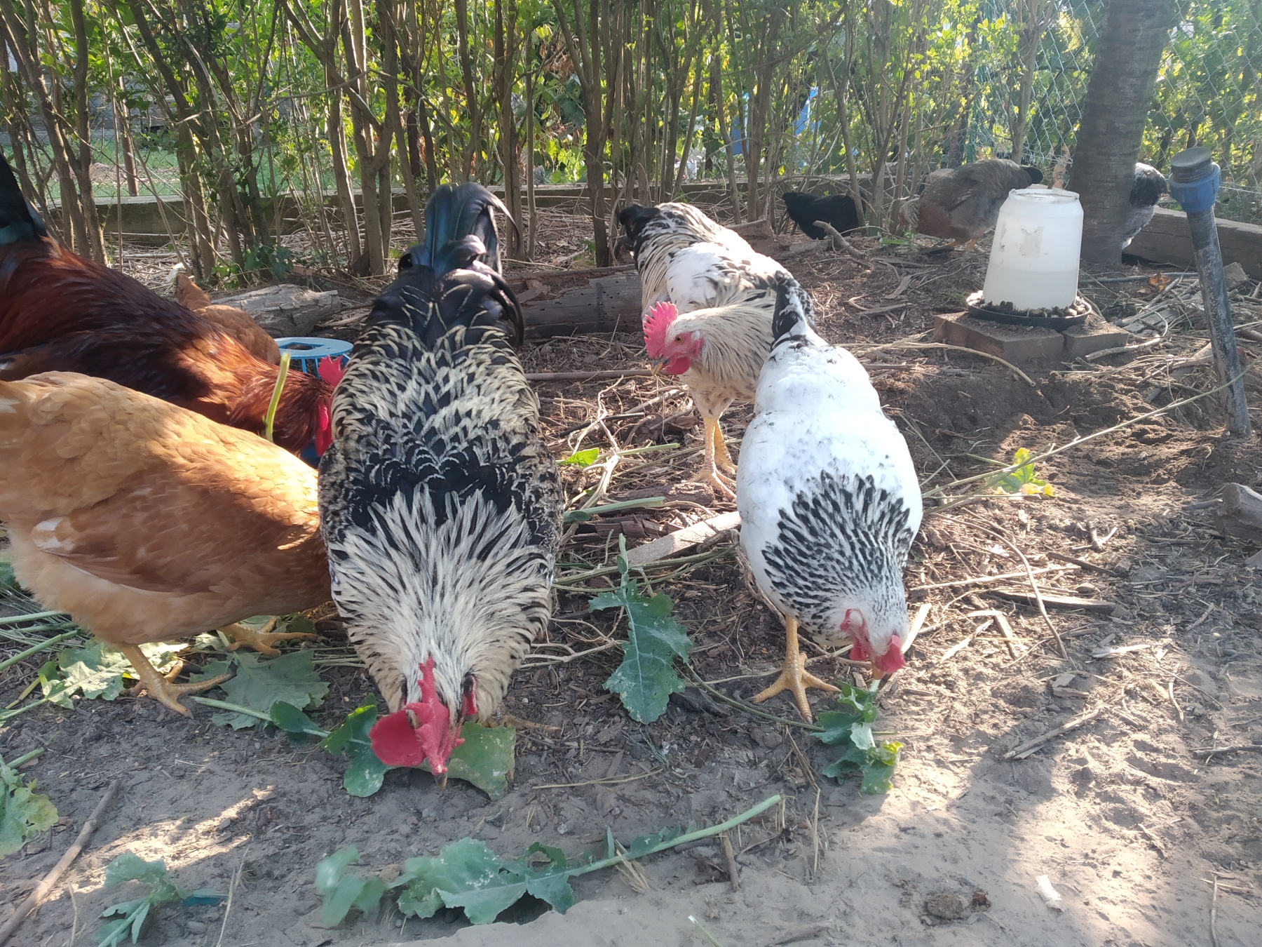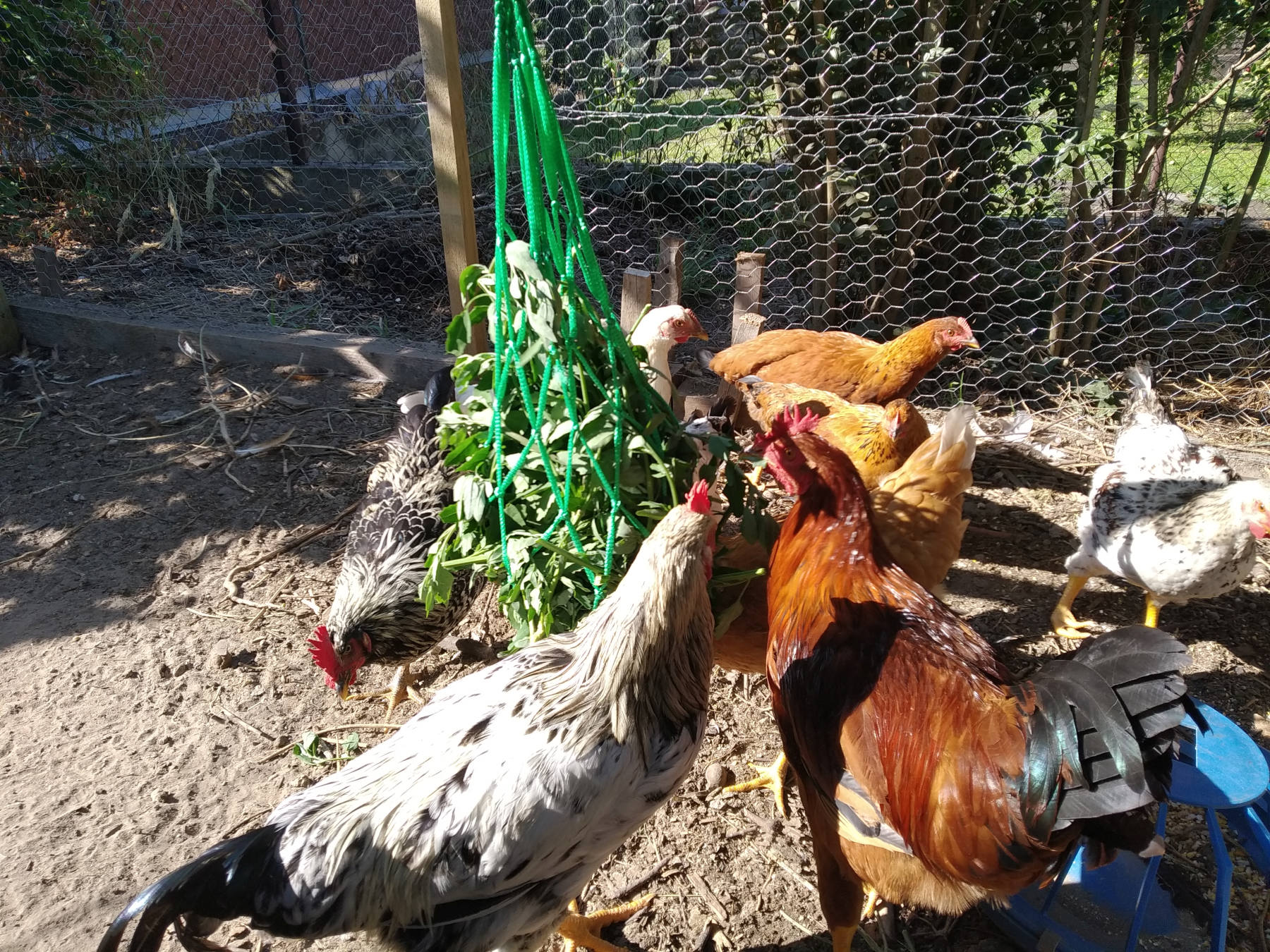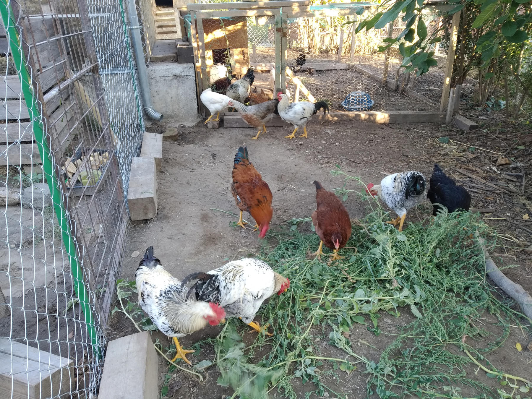 A nagyobbik Zöldikén rengeteg minden történt az elmúlt 9 hétben. Ági baromfiállományából származó csibéink immár rendes, tisztességes tyúkocskák és kakasok lettek és szeptember 2-án megörvendeztettek minket az első tojással. Elkészült a végleges tyúkól és kifutó így a két, egy hónapos korkülönbséggel keltetett csapat végre egy térbe kerülhetett. Volt egy kis összeszoktatási idő és némi kergetőzés, de már szépen elcsipegetnek egymás mellett. A lányommal minden tyúkot elneveztünk (tudom, nem szabadna, de legfeljebb fazék helyett nyugdíjba vonulnak ha már kiöregedtek a termelésből) és két kakas is nevet kapott. Úgyhogy a Zöldike tagságát Ági tyúkjain kívül immár Pötyi, Toffee, Liza, Luna, Gréti, Diána, Fruzsi, Petrezselyem és Ízisz látja majd el tojással és két gyönyörű kakas, a vörös Berci és a fekete Emil dolga lesz a tyúkok védelme és terelgetése.