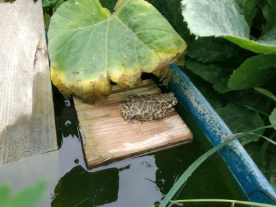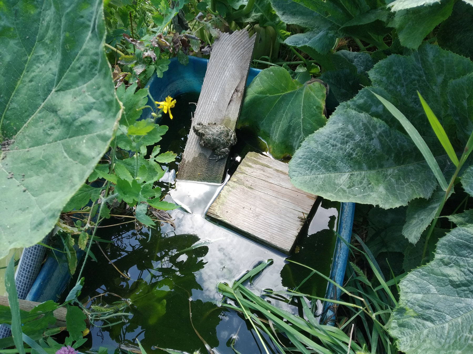 A biokertészkedés nem csak arról szól, hogy adott szabályok szerint termelünk, hanem arról is, hogy teret adunk, sőt, létesítünk minél több hasznos élő szervezetnek a kertünkben. A vizes élőhely nagyon fontos és a mi példánk mutatja, hogy nem kell több méteres tó, vagy a kerten átfolyó patak, egy egyszerű műanyag láda amit a kerti csap alá teszünk, nagyon nagy szolgálatot tehet az állatvilágnak. Itt a kertben egy zöld varangy pár választotta otthonául a csap alatti vizesládát, melyet szépen árnyékolnak a főzőtök levelei. Tettem bele napozó platformot és rámpát (maradék faanyag), a kis állatka pedig szépen ki is használja ezeket.