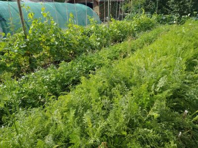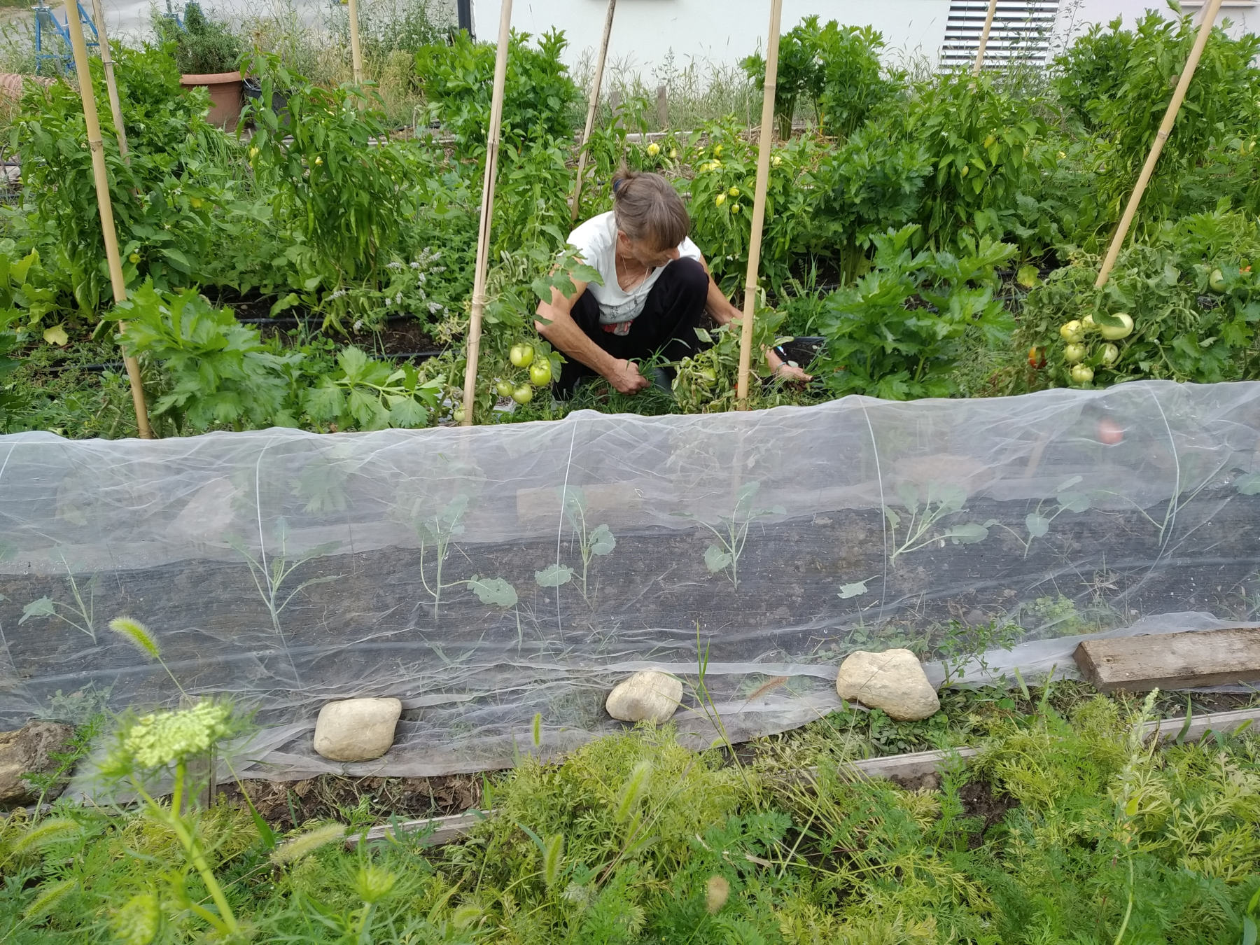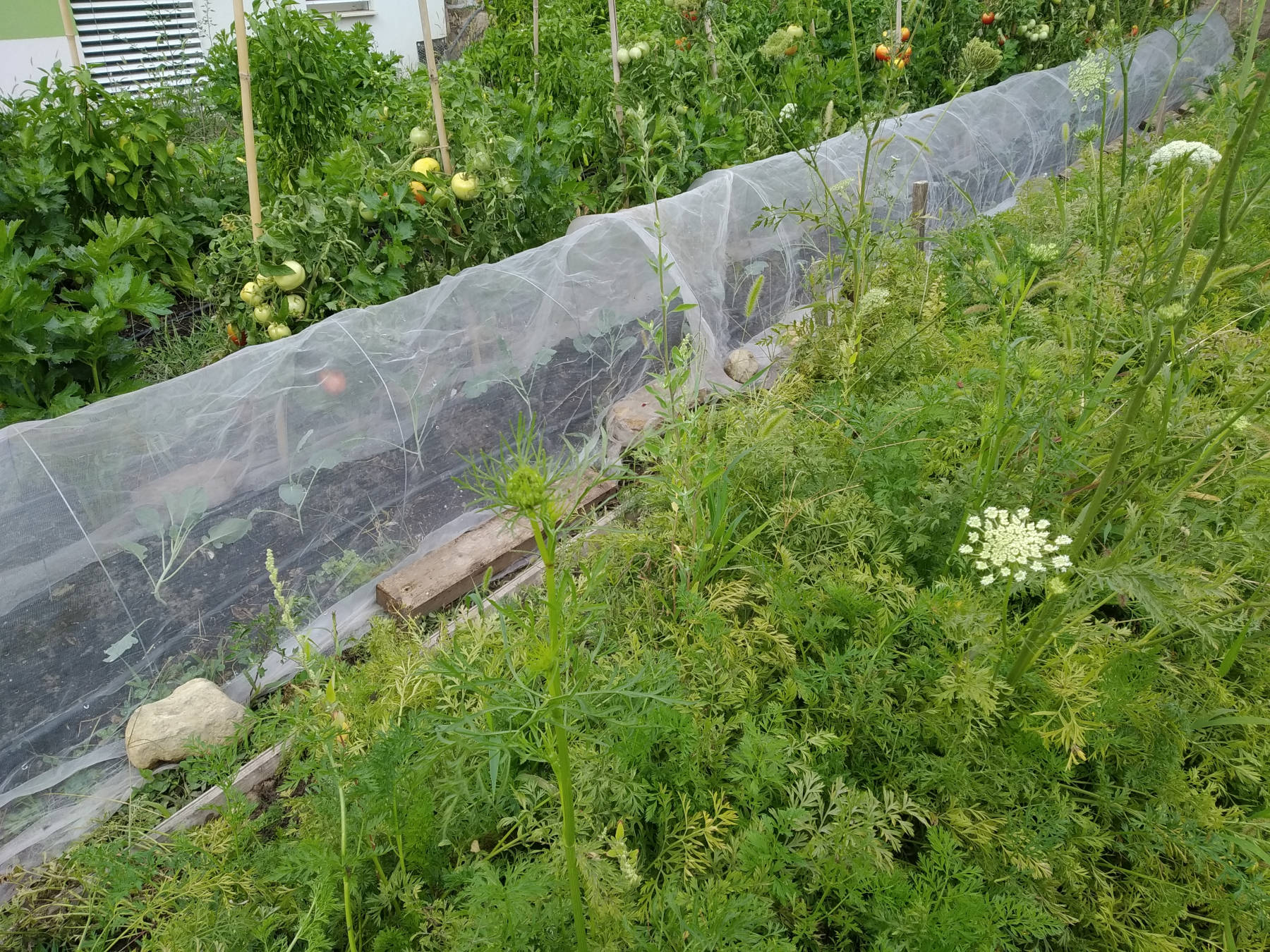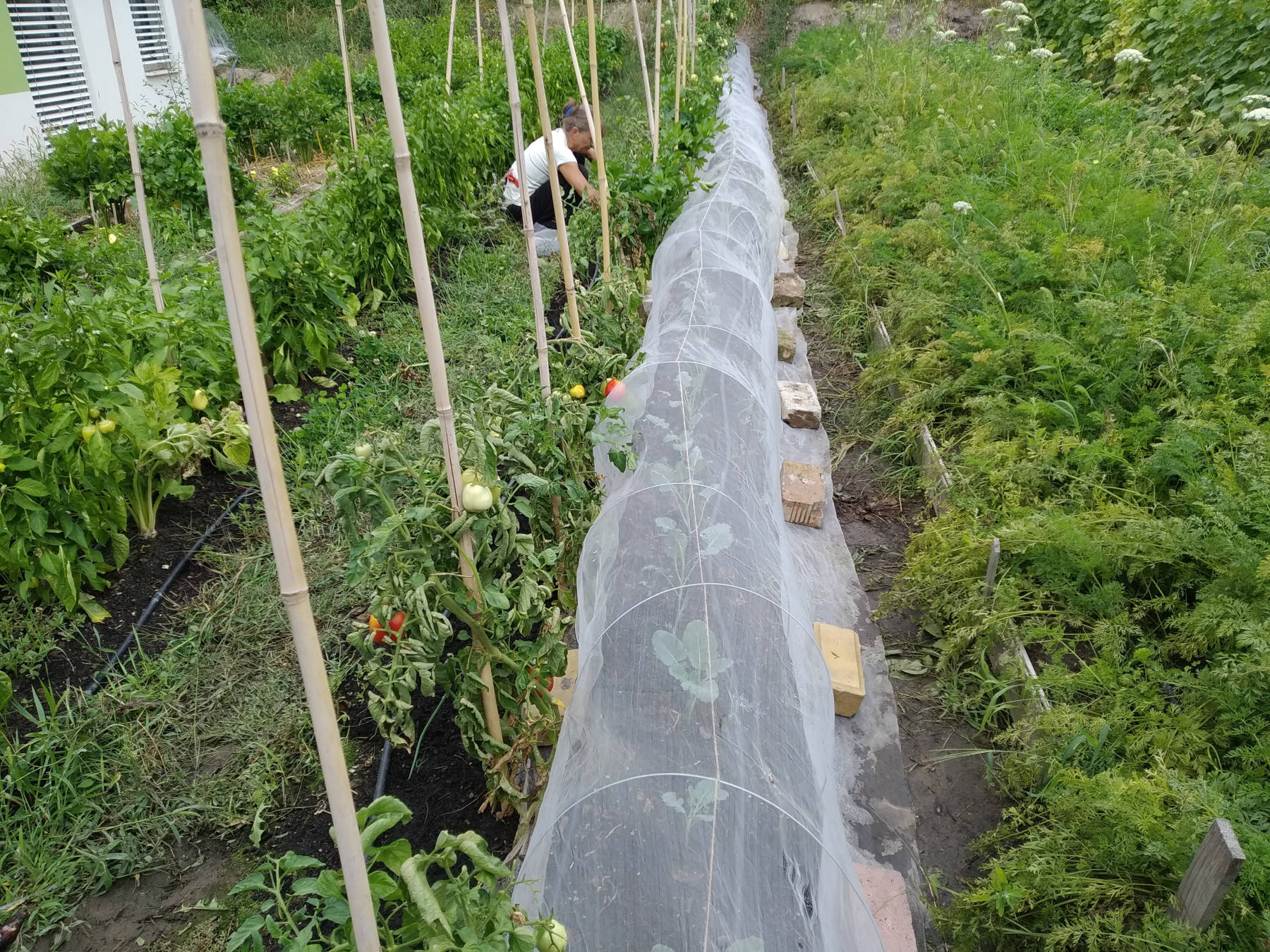 A zöldségeskert is sokat változott. A tavaszi ültetésű zöldbabokat kihúztuk, az utolsó termések még a tagok dobozába kerültek. Helyettük brokkoli, kapor, tarlórépa és hónapos retek került a sorokba. Másodvetésű zöldbabunk is termőre fordult, talán a héten egy keveset szedhetünk is róla. A vérsóska állományát felszámoltuk. Ez a szép évelő inkább dísznövénynek való, vagy olyan kertbe, ahol nem annyira fontos, hogy nagyobb mennyiség is legyen belőle. A vérsóska helyén most karalábé van, amelyet Artis Pro-val kezelt sorokba vetettünk és rovarhálóval takartunk, hogy megvédjük a földibolha, üvegházi molytetű és a káposztapoloska kártételétől. Az első kettő júliusban még nagyon virgonc volt, most már nem kell annyira tartanunk tőlük.
