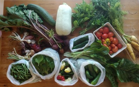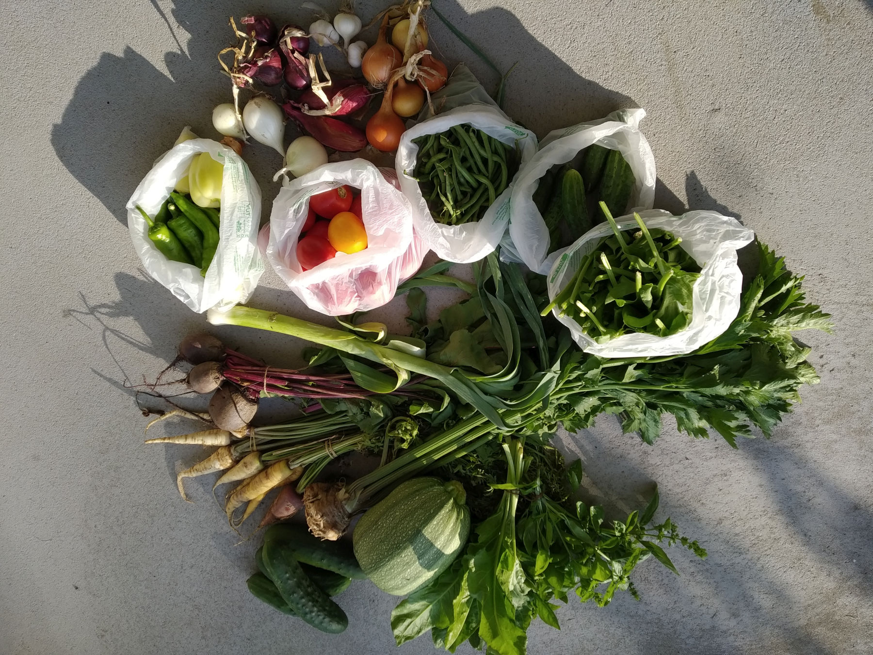 A dobozokba ezekben a hetekben hétről-hétre hasonló zöldségfélék kerültek, alkalmanként 12-13 faj és persze zöldfűszerek. Pár hete a nyakunkon maradt egy doboz zöldség, amelyet úgy használtam fel, mintha magam is tag lennék, tehát nem szedtem hozzá mást a kertből és csak egyféle, általunk nem termesztett zöldséget vásároltam hozzá, a burgonyát. Hogy mit tudtam 7 nap alatt kihozni egy doboz zöldségből, megnézhetitek facebook oldalunkon a #zoldsegdobozkihivas jelzésű posztokban. Annyit elárulhatok, hogy 17 ételbe illetve italba került zöldség. Készült többféle smoothie, leves, tojásétel, tésztaétel illetve húsos fogás sőt, két sütemény és egy lekvár is.