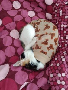 Július elején egy új cica is csatlakozott a csapathoz, a Dunaharaszti Állatvédők Alapítvány egy tagja vette észre a forgalmas út mellett kódorgó kis állatkát és kért számára segítséget. Pár napja átesett az ivartalanításon, ezért van a fotón cuki macis ruhában.